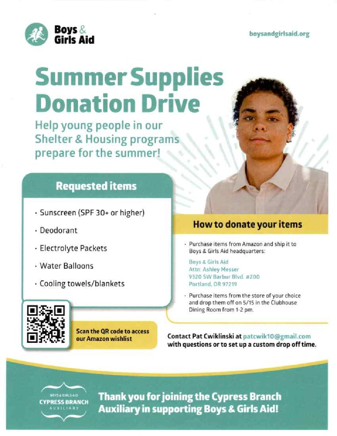 With the school year coming to a close, the Boys & Girls Aid are requesting supplies for the the young people in the shelter and housing programs. The Cypress Auxiliary is offering their assistance. See [...]